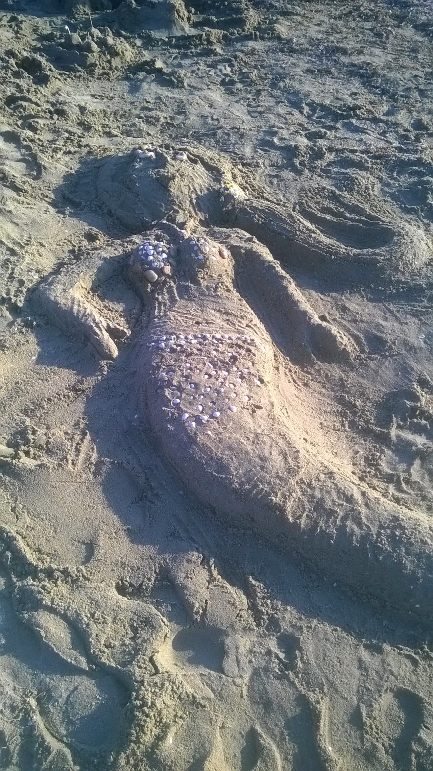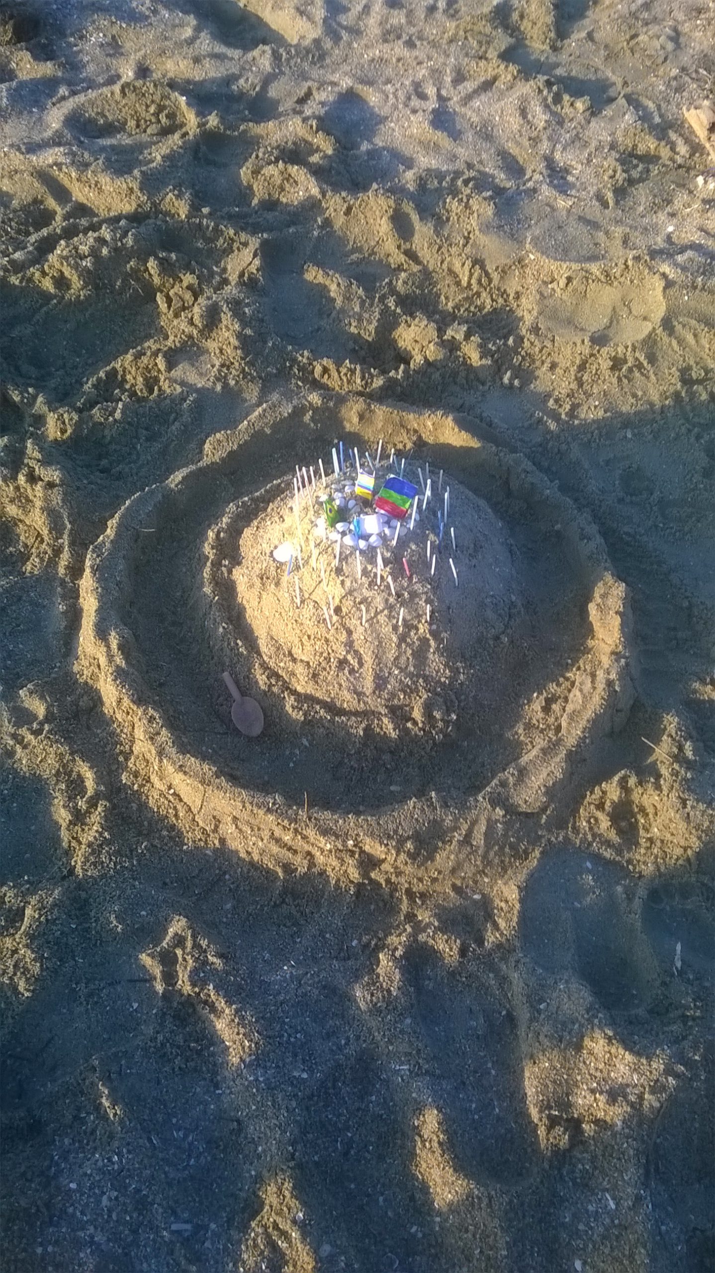 Στο ηλιοβασίλεμα τεράστια χταπόδια, καλαμάρια, καρχαρίες,χελώνες, γοργόνες, κοχύλια , πύργοι και καρδιές άφηναν το δικό τους μυστικό στο ακρογιάλι του Μπαξε.